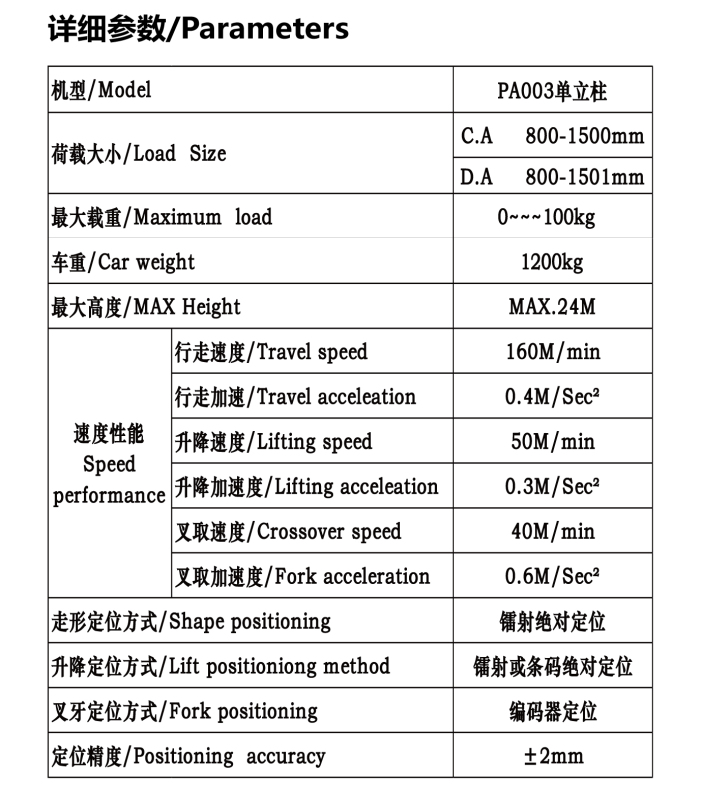 更靈活和更緊湊的倉儲需求,最大高度24米, 最大載重量1500千克。